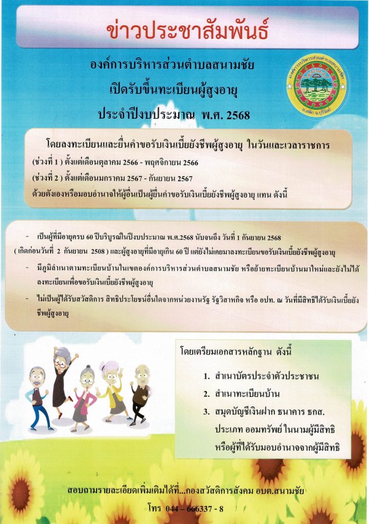 องค์การบริหารส่วนตำบลสนามชัย เปิดรับลงทะเบียนผู้มีสิทธิรับเบี้ยยังชีพผู้สูงอายุ ประจำปีงบประมาณ พ.ศ.2567 เพื่อรับเงินเบี้ยยังชีพผู้สูงอายุในปีงบประมาณ พ.ศ.2568
