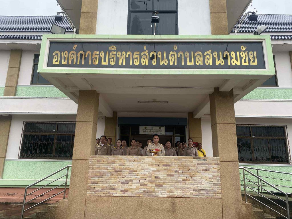 นายบุญเรือง จำปาบุรี นายกองค์การยริหารส่วนตำบลสนามชัย พร้อมด้วยคณะผู้บริหาร ปลัด อบต หัวหน้าส่วนราชการ ข้าราชการ และพนักงานเจ้าหน้าที่ ได้ร่วมเคารพธงชาติและร้องเพลงชาติอย่างพร้อมเพรียง